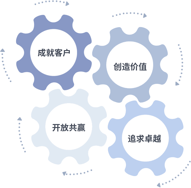 成就客户是一切决策的出发点,,创造价值是衡量所有工作的标准,,,追求卓越是我们做事做人的态度,,开放共赢是我们的格局也是最终的结果。。。价值观的齿轮环环相扣,,,,推动着组织里的每个人不断向前。。。。